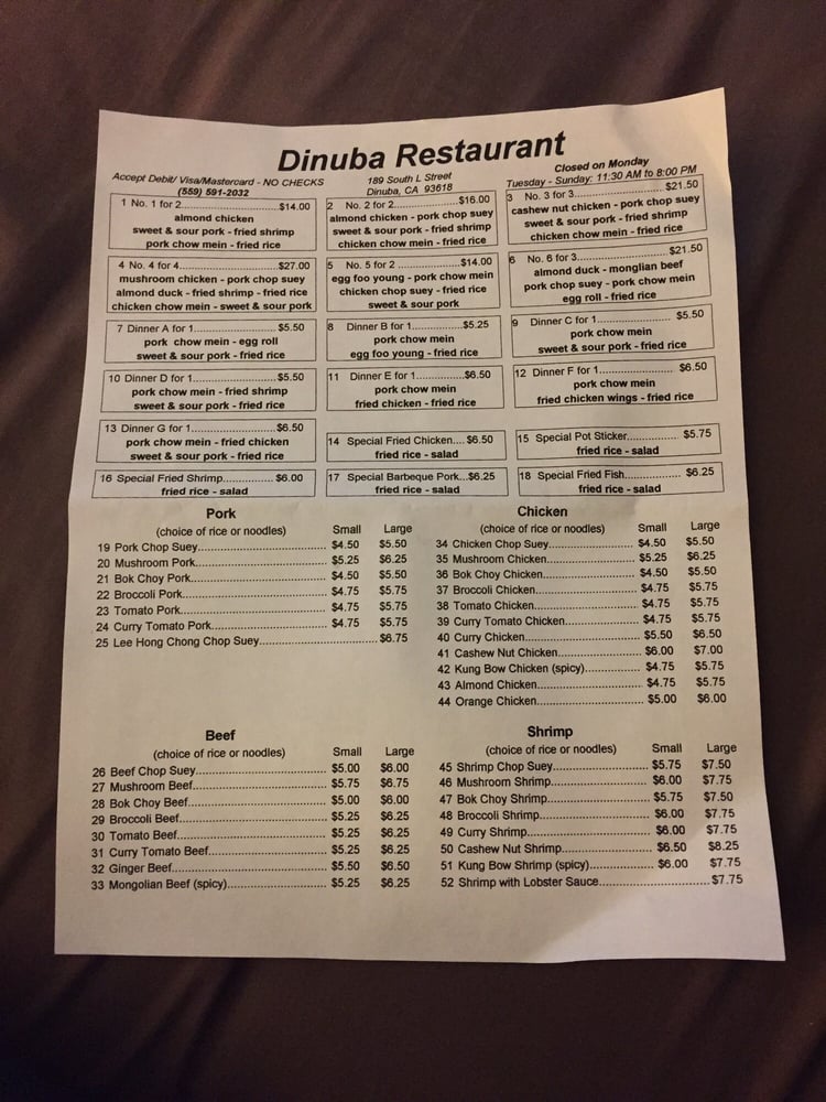 Introducing the menu at Dinuba Restaurant, a long-standing favorite in the Chinese food category. Located in Dinuba, CA, this restaurant offers a variety of options for all types of diners. From vegetarian dishes to meat-lover favorites, there is something for everyone. The restaurant provides options for dining in, takeout, and delivery, making it convenient for all customers. With a casual and welcoming atmosphere, Dinuba Restaurant is suitable for groups, families, and even kids. Customers rave about the consistency and quality of the food, with many mentioning their favorite dishes like special chicken and Mongolian beef. If you're in the mood for authentic Chinese cuisine, Dinuba Restaurant is the place to go. Don't miss out on their delicious fried chicken dinner or flavorful fried rice. Trust the reviews and experience the best Chinese food in Dinuba at Dinuba Restaurant.